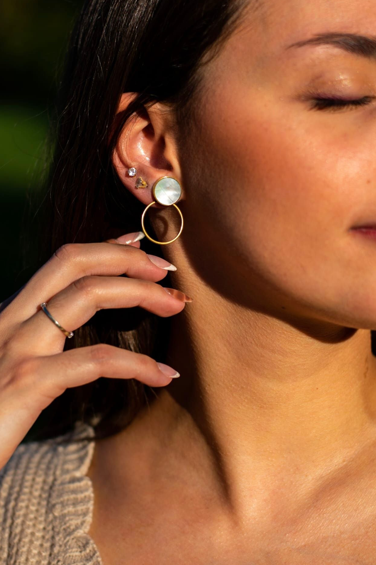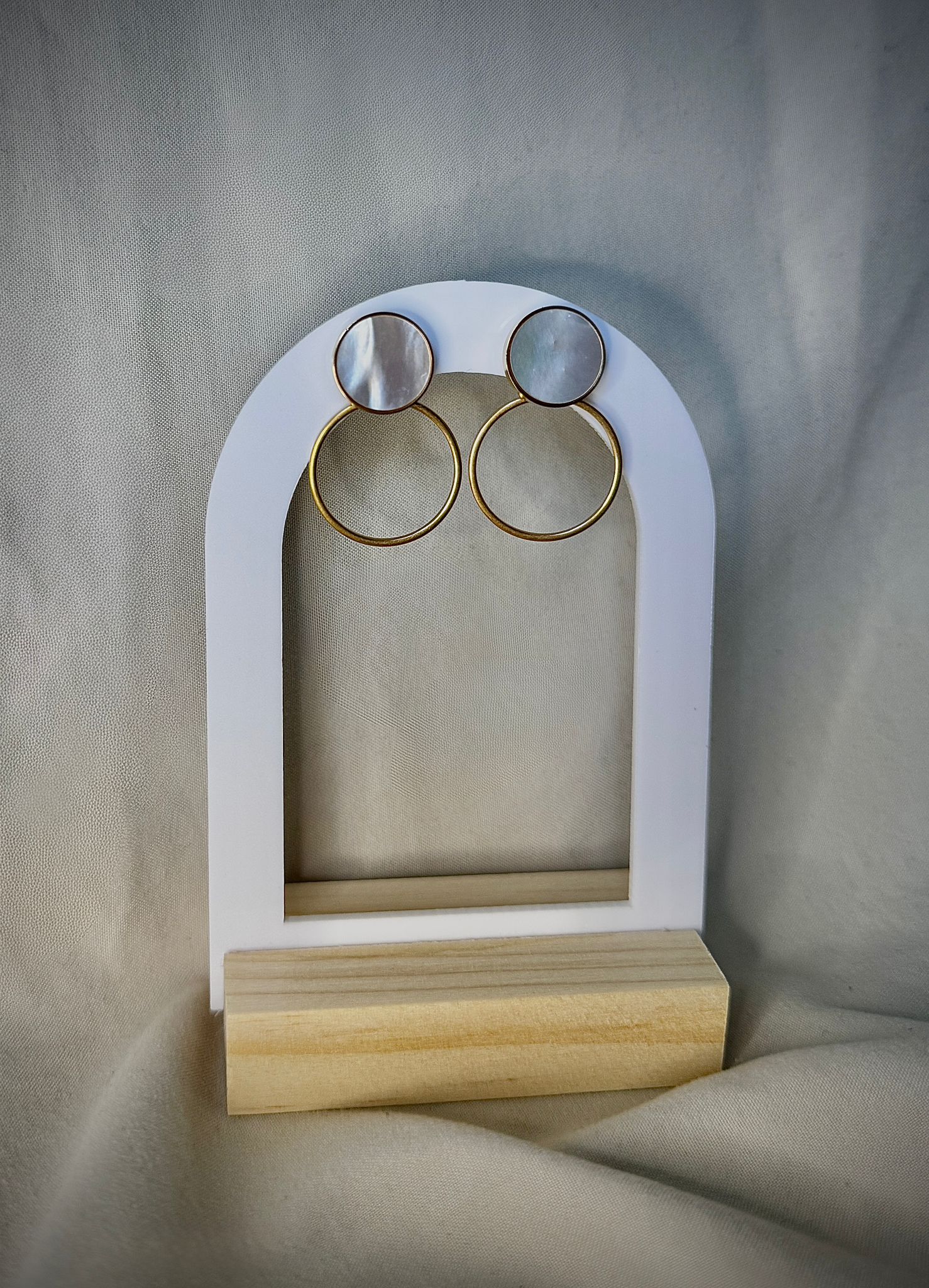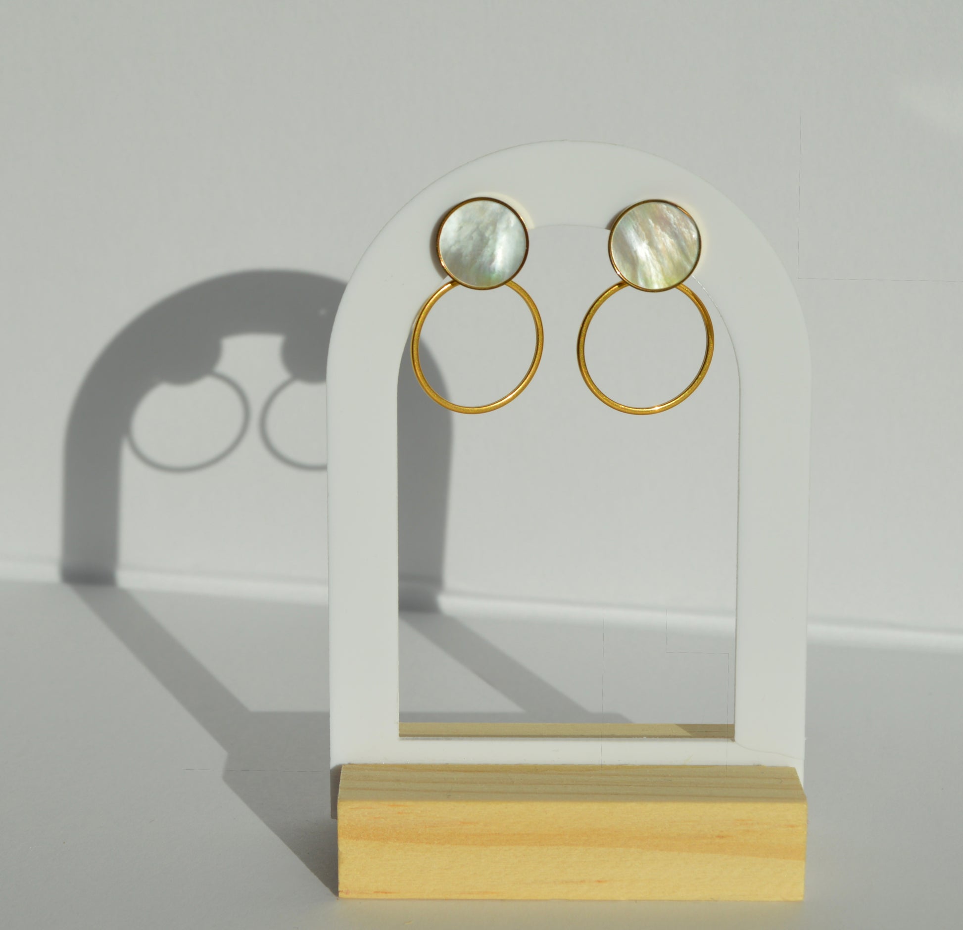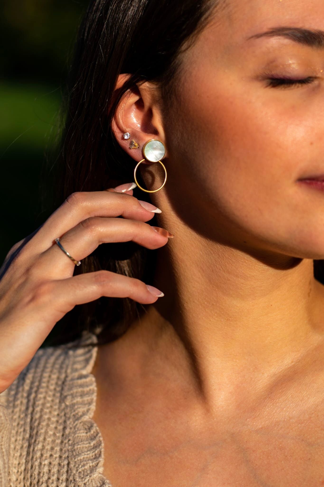 Composées d’un cercle doré en acier inoxydable et d’un médaillon en nacre naturel, elles captent délicatement la lumière pour un rendu à la fois chic et intemporel.