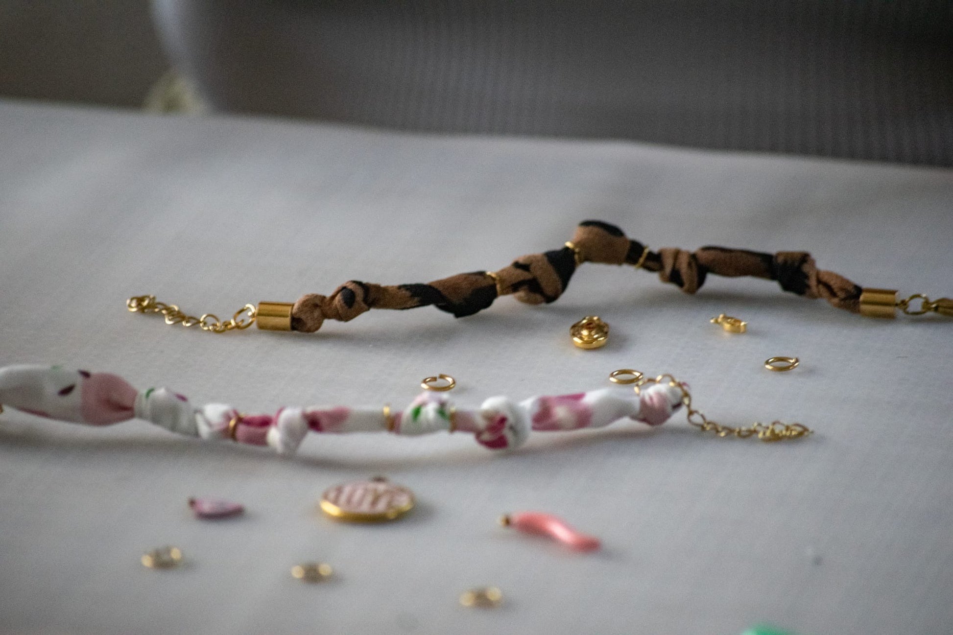 Confectionné en tissu délicatement noué, il est sublimé par des détails et pendentifs en acier inoxydable doré aux lignes fines et harmonieuses. Ces éléments captent subtilement la lumière et apportent une note élégante et féminine à ce bijou au style bohème.