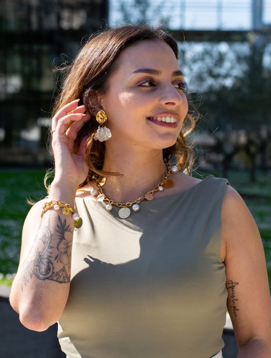 Composées d’un clou d’oreille martelée en acier inoxydable et de pétales blancs aux reflets nacrés, elles captent délicatement la lumière pour un rendu à la fois doux et élégant.