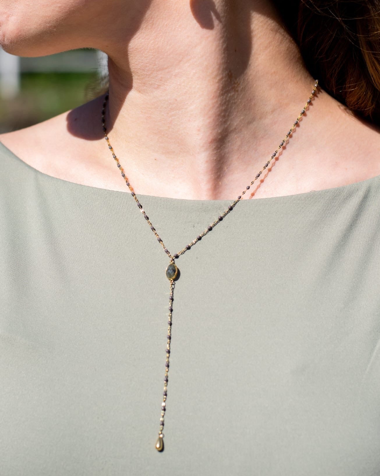 Laissez-vous séduire par l’allure du collier Giulia. Ce bijou a été pensé pour étirer la silhouette et capter la lumière avec élégance grâce à sa pierre naturelle qui attire le regard.