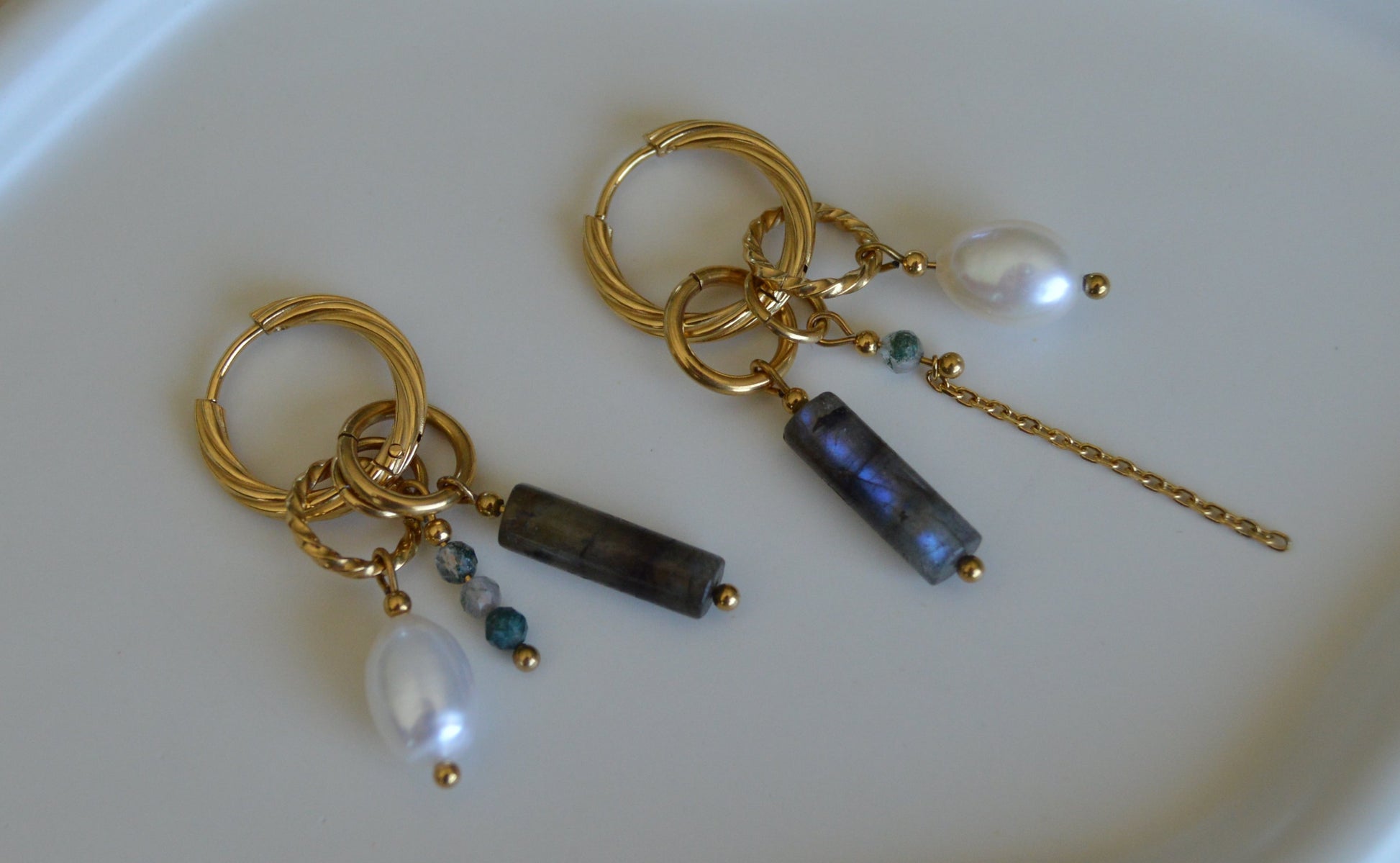 • Labradorite : L'alliance d'un cylindre en Labradorite aux reflets changeants et de petites perles d'Agate Mousse aux nuances vert forêt.