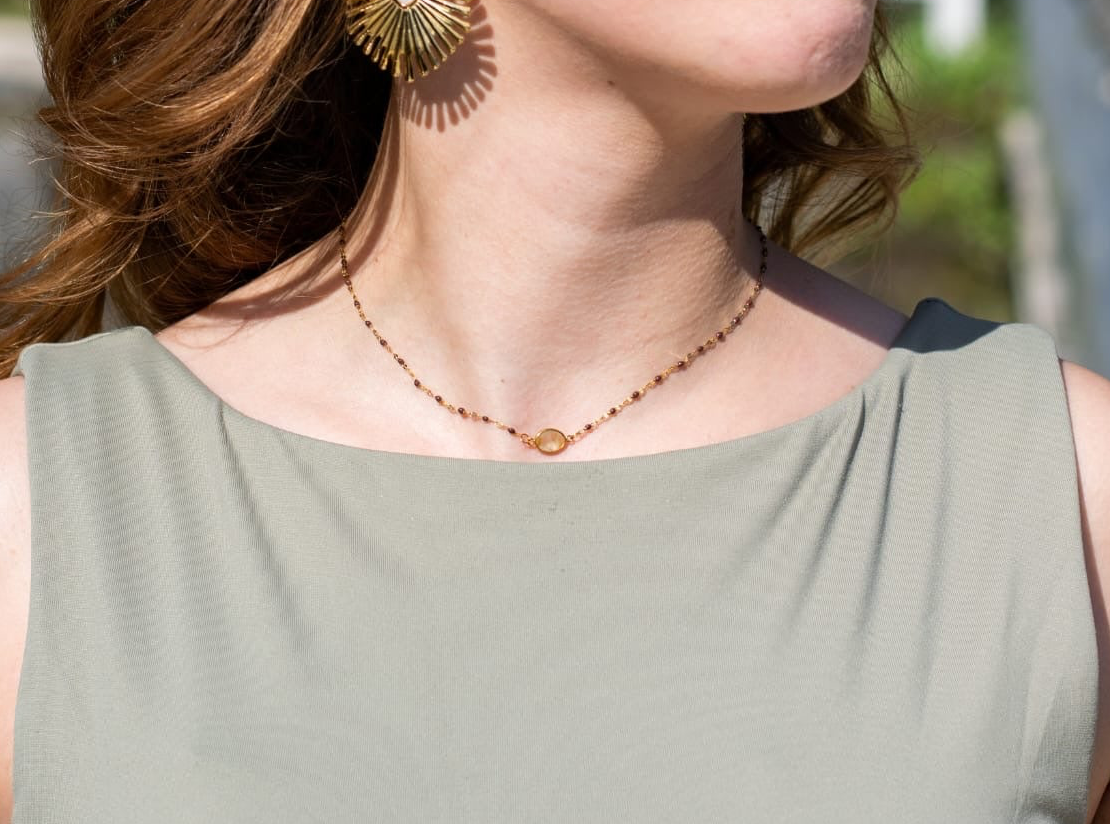 On l’aime pour son caractère authentique et son élégance. C’est le collier qu’on ne quitte plus : il apporte immédiatement de la profondeur à une tenue simple grâce au contraste entre l’acier inoxydable et la douceur de la pierre naturelle.