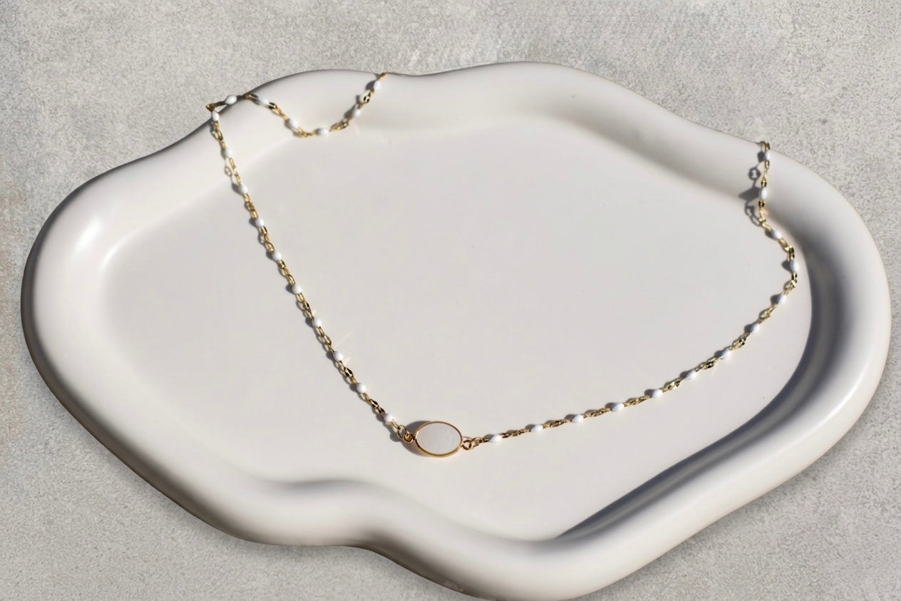 Laissez la lumière naturelle s'inviter à votre cou avec le collier Livia. Ce cOllier moderne capte chaque rayon grâce à sa pierre naturelle centrale, offrant un éclat subtil et raffiné à votre quotidien.