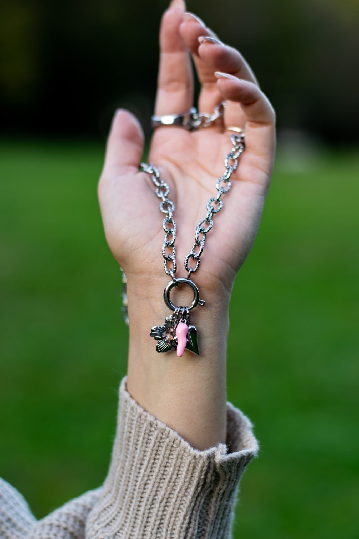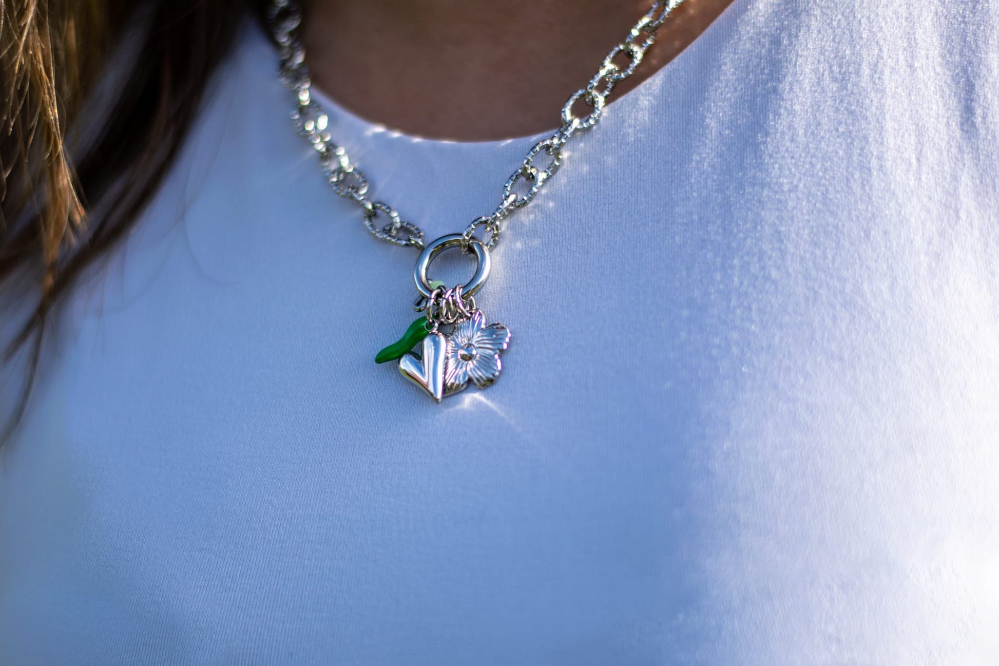 Composé d’une chaîne argentée épaisse en acier inoxydable et de différents pendentifs – un joli cœur, un piment piquant, une douce fleur et de petites perles délicates – ce collier est la parfaite alliance entre modernité et féminité.