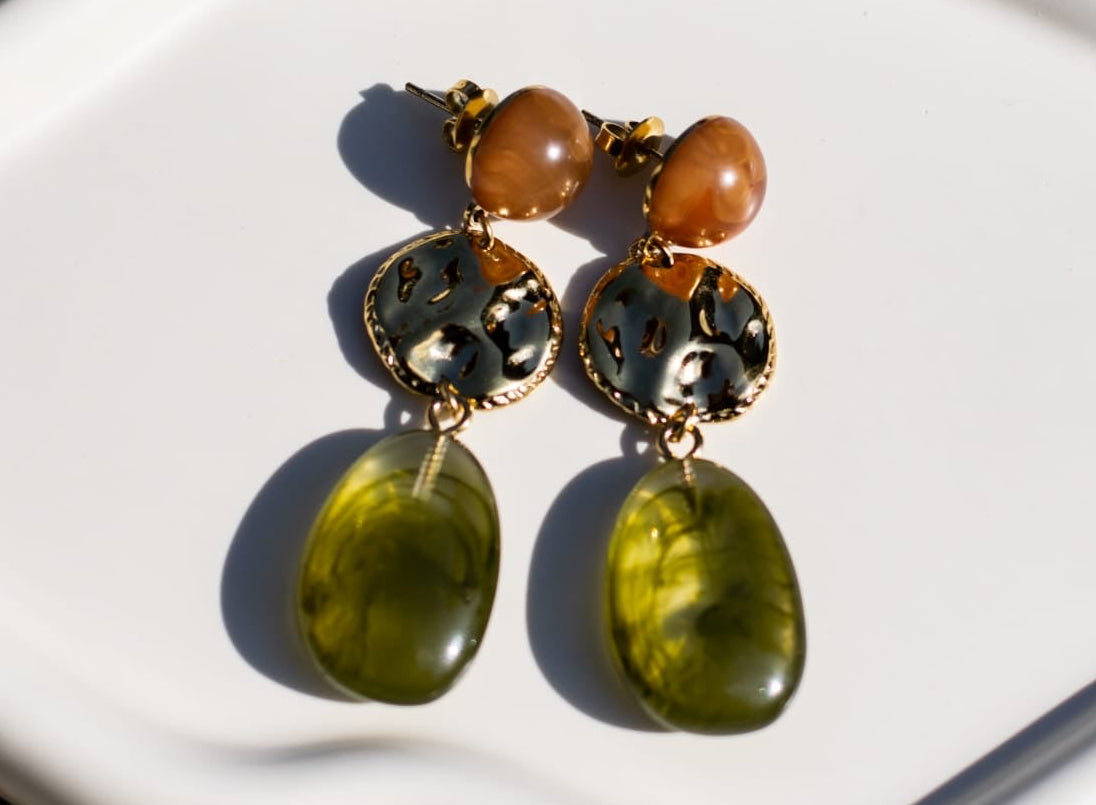 Ce modèle joue sur les contrastes de matières en associant une perle ambrée, un médaillon doré à l’aspect martelé et une goutte en résine vert olive aux reflets marbrés.