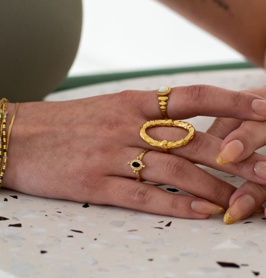 On l’aime pour son allure. Son design travaillé autour de la pierre lui donne un côté précieux. C’est la bague idéale pour ajouter une touche de couleur minérale et de force à votre style quotidien.